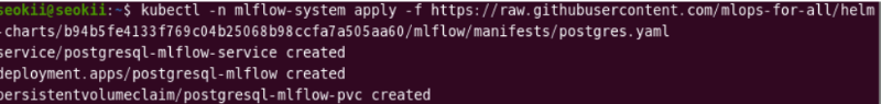 kubectl -n mlflow-system apply -f https://raw.githubusercontent.com/mlops-for-all/helm-charts/b94b5fe4133f769c04b25068b98ccfa7a505aa60/mlflow/manifests/postgres.yaml