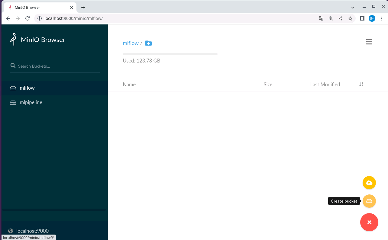아래 하단의 Create bucket 버튼을 눌러 이름을 mlfow로 입력하고 사진과 같이 버킷을 생성합니다.