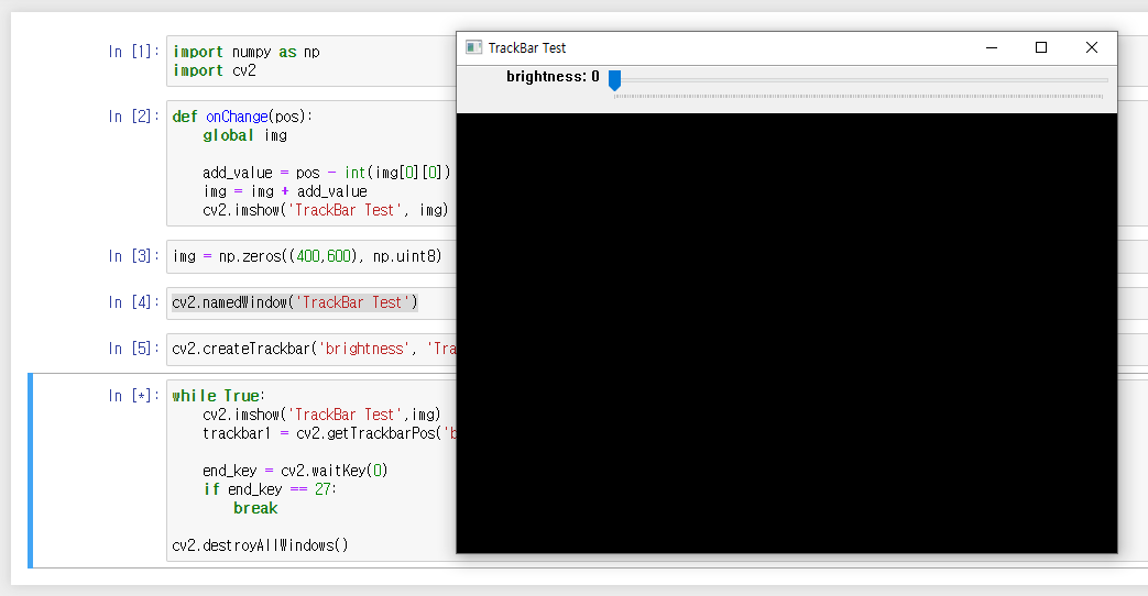 trackbar1 = cv2.getTrackbarPos('brightness', 'TrackBar Test')